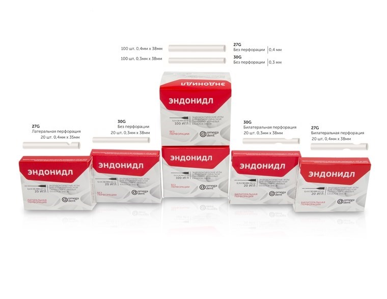 "ЭНДОНИДЛ" выпускаются без перфорации, с латеральной перфорацией или с билатеральной перфорацией. Иглы длиной 35-38 мм с оптимальным диаметром 0,4 мм. (27G) или 0,3 мм (30G).
