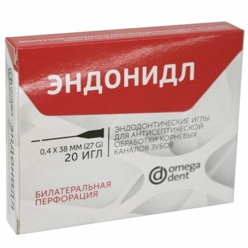 Эндодонтический инструмент с латеральной перфорацией «ЭНДОНИДЛ» является иглой длиной 35–38 мм с оптимальным диаметром 0,4 или 0,3 мм. Благодаря тупому срезу ее кончика становится невозможным механическое повреждение верхушки корня зуба. Латеральная перфорация, представленная в виде одного или двух отверстий, располагается на расстоянии 3 мм от кончика иглы (такое размещение предотвращает создание чрезмерного давления и заапикальное введение ирригационного раствора).