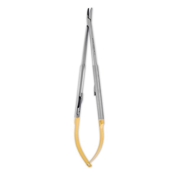 Вкладки из карбида вольфрама с алмазным напылением обеспечивают надежный захват иглы и шовного материала. Фиксатор на внутренней стороне ручек предотвращает непроизвольное раскрытие рабочих частей.