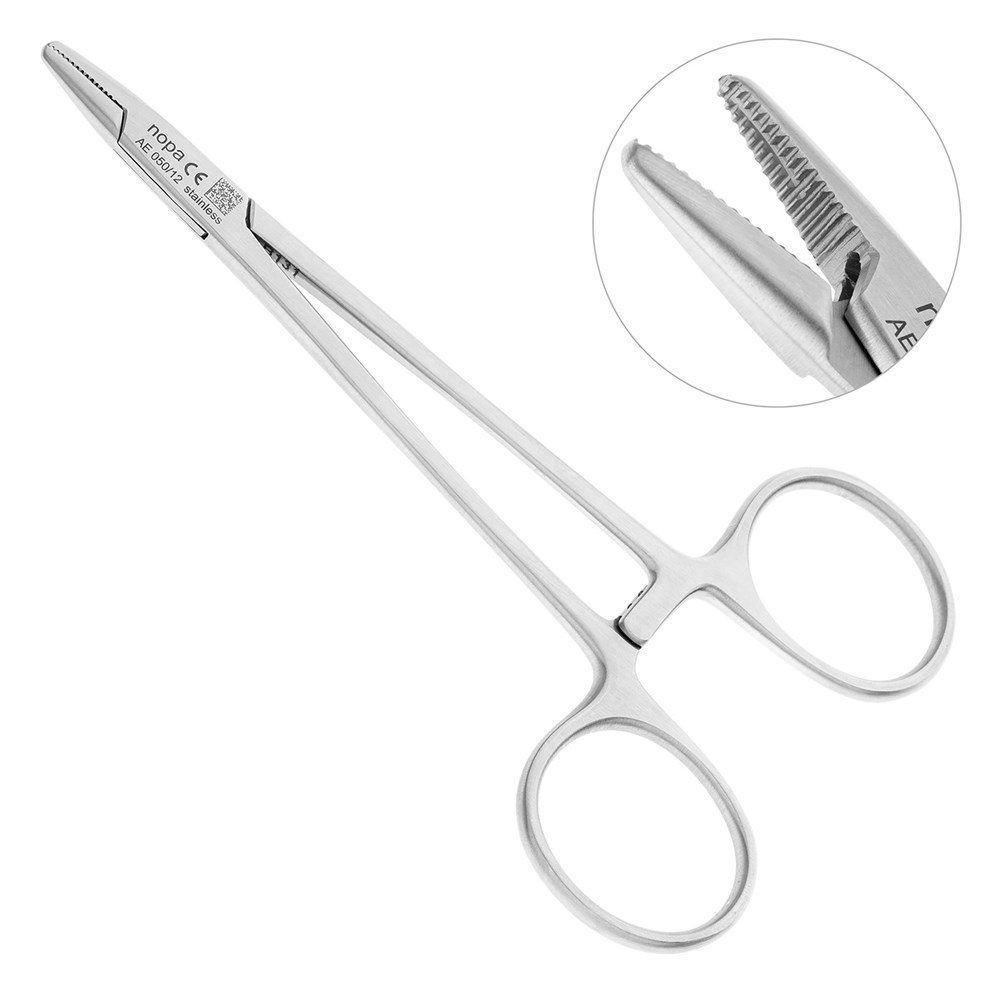 Хирургический иглодержатель Derf применяется для проведения хирургической иглы через ткани при наложении швов. Прямая рабочая часть инструмента на внутренних поверхностях имеет крестообразные насечки, благодаря которым иглодержатель плотно фиксируется на плоскости хирургической иглы и обеспечивает точность проведения иглы на всех стадиях наложения швов.