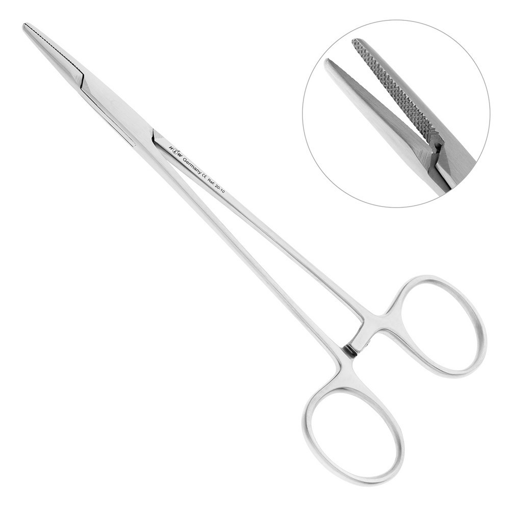 Прямые рабочие части на внутренних поверхностях инструмента покрыты мелкозернистым ретенционным узором, предупреждающим скольжение иглодержателя по плоскости хирургической иглы при наложении шва. Рабочие концы инструмента короткие, массивные и тупоконечные. Такая конструкция щечек иглодержателя упрощает захват и освобождение иглы, а также способствует точному проведению иглы на всех стадиях наложения швов.