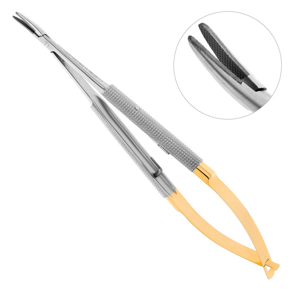 Рабочие поверхности инструмента имеют вставки из твердого сплава карбид-вольфрама, которые обеспечивают повышенную устойчивость к истиранию. Насечки на внутренней поверхности щечек препятствует скольжению иглодержателя по плоскости хирургической иглы. Изгиб по плоскости в рабочей части позволяет использовать инструмент на труднодоступных участках полости рта, не беспокоясь о том, что иглодержатель закроет обзор.