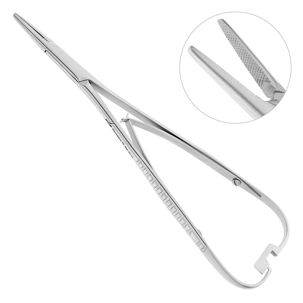 Наружная поверхность плоских ручек покрыта поперечными бороздками, предотвращающими скольжение фаланг пальцев в перчатке. С внутренней стороны к каждой ручке прикреплена пластиночная разводная пружина, увеличивающая срок службы и обеспечивающая плавный ход иглодержателя. Инструмент снаружи снабжен кремальерным замком, который обеспечивает удержание иглодержателя в замкнутом положении, а также контролирует силу сдавливания. Подходит для нити 3/0-4/0.