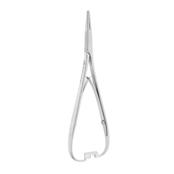 Иглодержатель безкольцевой конструкции МАТЬЕ (по автору). Рабочие части иглодержателя имеют стандартный вид, суженный к концу и закругленный, внутренняя поверхность браншей имеет ретенционный диагональный микрорельеф. Промежуточная часть переходит в рукоятки, покрытые поперечными углублениями предотвращения скольжения в руке.