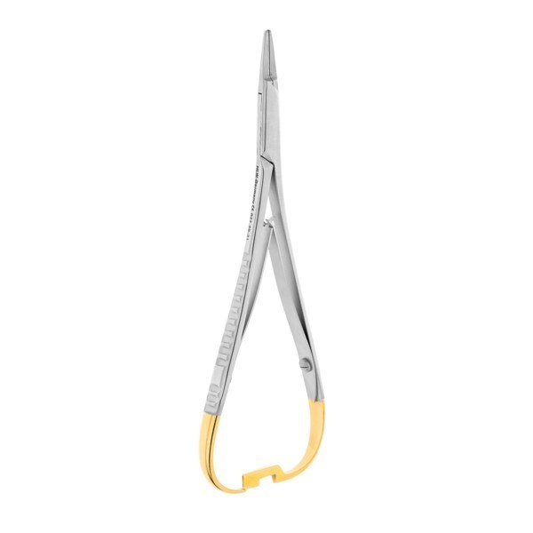 Иглодержатель безкольцевой конструкции МАТЬЕ (по автору). Рабочие части иглодержателя имеют закругленный кончик и вытянутую узкую форму с параллельными стенками, внутренняя поверхность браншей имеет вклеенные вставки из твердого сплава и ретенционный диагональный микрорельеф.