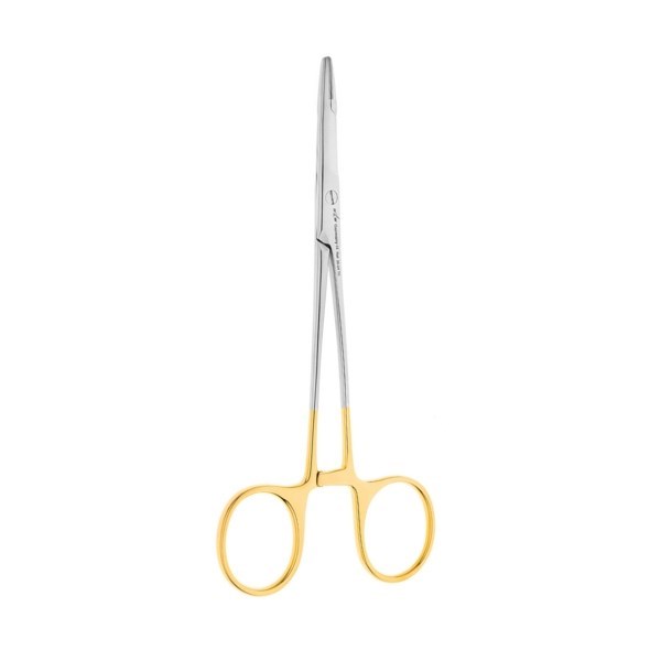 Иглодержатель конструкции ОЛСЕН-ГЕГАРА. Снабжен стандартными кольцевыми держателями и трехступенчатым нажимным фиксатором. Внутренняя поверхность браншей имеет ретенционный диагональный микрорельеф. Острые углы в местах смыкания инструмента сточены. На рабочих частях имеются твердосплавные вставки из карбида вольфрама.