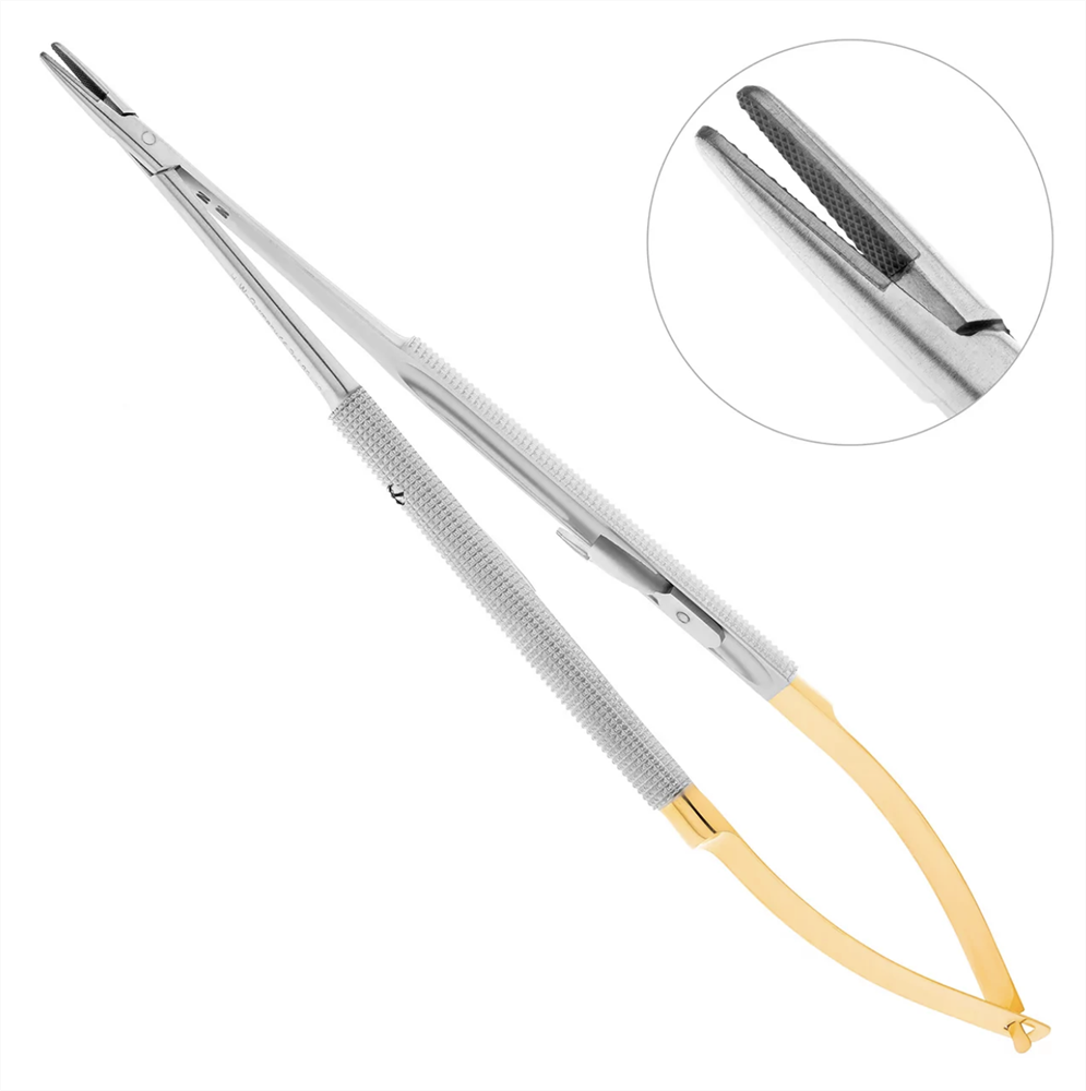 Производственной компанией HLW Dental Instruments для работы с тонким шовным материалом и небольшими иглами изготовлен иглодержатель микрохирургический Castroviejo-Gomel TC (Кастровьехо).