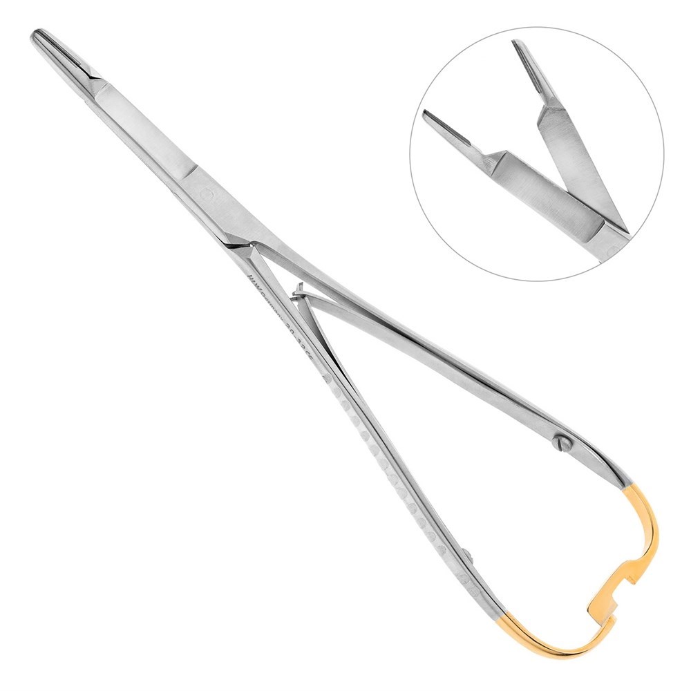 Прямые рабочие части инструмента имеют вытянутую узкую форму, облегчающую захват и освобождение иглы, в том числе, на труднодоступных участках полости рта. Благодаря насечкам на внутренних поверхностях иглодержателя инструмент надежно фиксируется и не скользит по плоскости хирургической иглы при наложении шва. Вставки из твердого сплава карбид-вольфрама на внутренних поверхностях щечек иглодержателя обеспечивают повышенную устойчивость к истиранию.