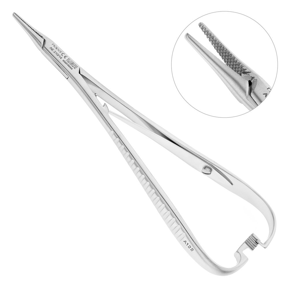 Иглодержатель Mathieu (Матье) торговой марки Nopa Instruments Medizintechnik GmbH используется для проведения хирургической иглы через ткани при наложении швов. Прямые рабочие части имеют крестообразные насечки, препятствующие скольжению иглодержателя по поверхности хирургической иглы при наложении шва. Рабочие концы инструмента небольшие, суженные и закругленные на конце. Такая конструкция щечек иглодержателя упрощает захват и освобождение иглы, а также обеспечивает точность проведения иглы на всех стадиях наложения швов.