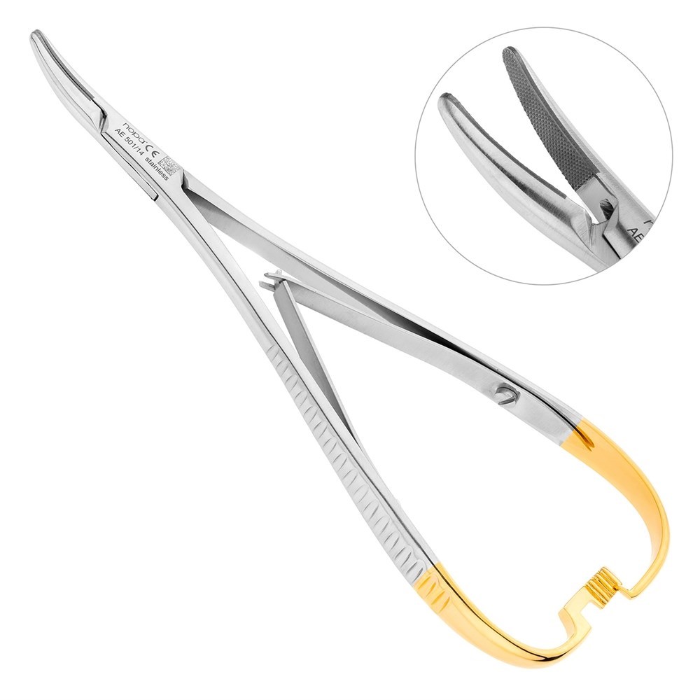 Иглодержатель MATHIEU применяется для проведения атравматической иглы через ткани при наложении швов. Изогнутые рабочие части инструмента имеют вытянутую узкую форму, облегчающую захват и освобождение иглы, в том числе, на труднодоступных участках полости рта. Благодаря насечкам на внутренних поверхностях щечек иглодержателя инструмент надежно фиксируется и не скользит по плоскости хирургической иглы при наложении шва. Вставки из твердого сплава карбид-вольфрама на внутренних поверхностях щечек иглодержателя обеспечивают повышенную устойчивость к истиранию.