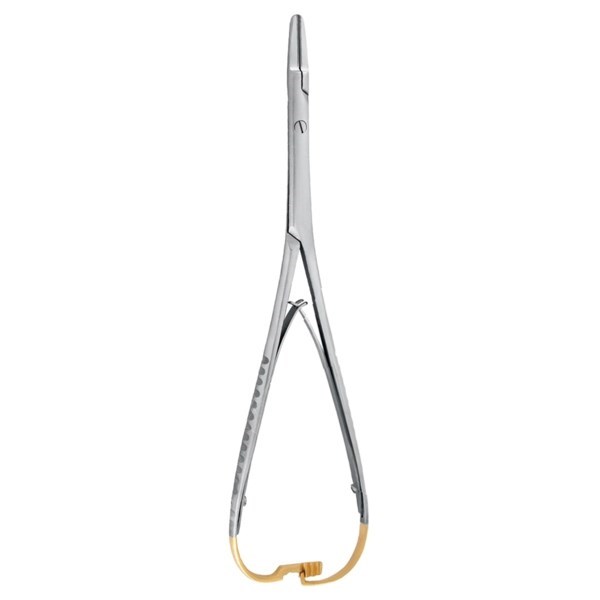 Рабочие части иглодержателя узкой вытянутой формы. Это облегчает захват и освобождение иглы. Насечки на внутренних поверхностях иглодержателя не позволяют инструменту скользить по плоскости хирургической иглы при наложении шва.