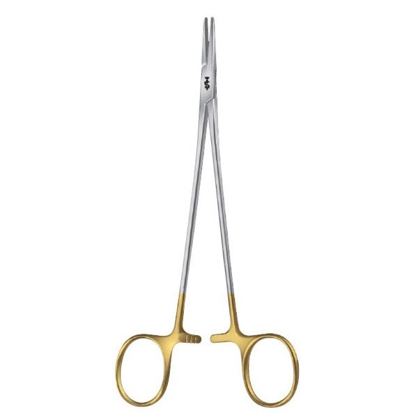 Иглодержатель по DE BAKEY, DUROGRIP, длина 150 мм, для нитей 4/0-6/0, BM032R, B.Braun (Aesculap, Германия) используют для наложения швов, как поверхностных на коже, так и при оперативных вмешательствах. Инструмент выполнен с твердосплавными вставками на основе кобальта, имеет эргономичную форму, с учетом анатомических особенностей, для удобного расположения в руке и точной работы врача. Кольца рукоятки позолоченные, между ними расположен замок - кремальера, который фиксирует положение рукояток иглодержателя. На браншах нанесены специальные насечки, которые позволяют прочно удерживать иглы в процессе наложения швов.