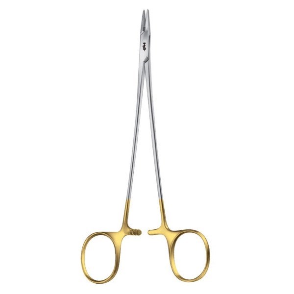 Иглодержатель по DE BAKEY, DUROGRIP, длина 165 мм, BM063R, B.Braun (Aesculap, Германия) используют для наложения швов, как поверхностных на коже, так и при оперативных вмешательствах. Инструмент выполнен с твердосплавными вставками на основе кобальта, имеет эргономичную форму, с учетом анатомических особенностей, для удобного расположения в руке и точной работы врача. Кольца рукоятки позолоченные, между ними расположен замок - кремальера, который фиксирует положение рукояток иглодержателя. На браншах нанесены специальные насечки, которые позволяют прочно удерживать иглы в процессе наложения швов.