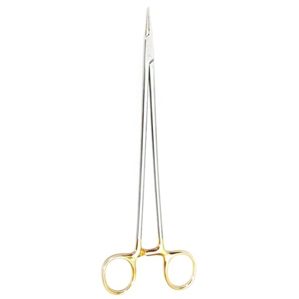 Иглодержатель по DE BAKEY, DUROGRIP, длина 230 мм, для нитей 4/0-6/0, BM036R, B.Braun (Aesculap, Германия) используют для наложения швов, как поверхностных на коже, так и при оперативных вмешательствах. Инструмент выполнен с твердосплавными вставками на основе кобальта, имеет эргономичную форму, с учетом анатомических особенностей, для удобного расположения в руке и точной работы врача. Кольца рукоятки позолоченные, между ними расположен замок - кремальера, который фиксирует положение рукояток иглодержателя. На браншах нанесены специальные насечки, которые позволяют прочно удерживать иглы в процессе наложения швов.