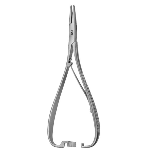 Иглодержатель по MATHIEU, длина 170 мм, BM361R, B.Braun (Aesculap, Германия) используют для удержания иглы, а также отрезания нити во время проведения хирургических операций. Инструмент состоит из полукруглых ручек, на которых нанесены поперечные бороздки, обеспечивающие крепкий захват в руке и препятствующие выскальзыванию. Между ручками расположен замок кремальера, фиксирующий положение рукоятки иглодержателя. Рабочая часть прямая, на внутренней стороне губок нанесены крестообразные насечки для крепкого удержания иглы.