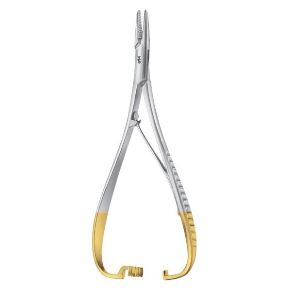 Иглодержатель по MATHIEU, DUROGRIP, длина 200 мм, для нитей до 3/0, BM154R, B.Braun (Aesculap, Германия) используют для наложения швов, как поверхностных на коже, так и при оперативных вмешательствах. Инструмент выполнен с вольфрамовыми вставками. Рукоятки позолоченные, между ними расположен замок — кремальера, который фиксирует положение рукояток иглодержателя. На браншах нанесены специальные насечки, которые позволяют прочно удерживать иглы в процессе наложения швов.