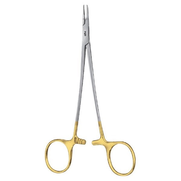 Иглодержатель по RYDER, DUROGRIP, тонкий, длина 155 мм, для нитей 6/0-10/0, BM055R, B.Braun (Aesculap, Германия) используют для наложения швов, как поверхностных на коже, так и при оперативных вмешательствах. Инструмент выполнен с твердосплавными вставками на основе кобальта, имеет эргономичную форму, с учетом анатомических особенностей, для удобного расположения в руке и точной работы врача. Кольца рукоятки позолоченные, между ними расположен замок — кремальера, который фиксирует положение рукояток иглодержателя. На браншах нанесены специальные насечки, которые позволяют прочно удерживать иглы в процессе наложения швов.