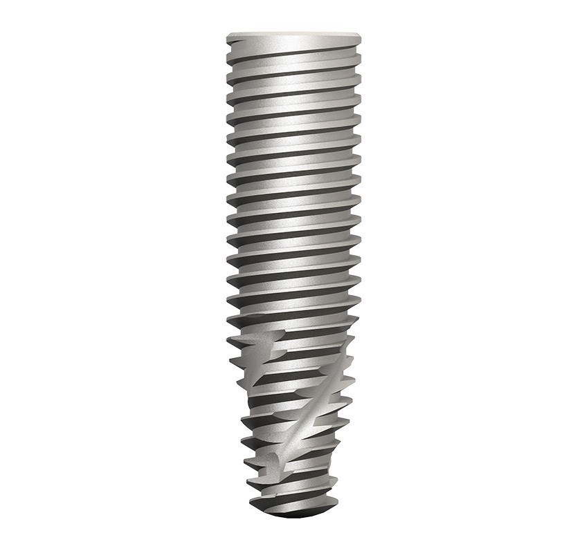 Динамический прогрессивный дизайн резьбы: трапециевидные витки резьбы в корональной части способствуют компрессии, а V-образные витки резьбы в апикальной части отвечают за само-нарезание резьбы в кости;