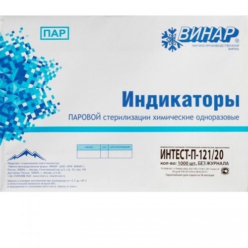 Индикатор стерилизации «Винар ИнТест-П-121/20» без журнала. Класс 4 (многопеременные индикаторы) по ГОСТ ISO 11140-1-2011. Предназначены для применения в каждом цикле стерилизации для наружного и внутреннего контроля условий стерилизации в стерилизаторах с удалением воздуха из стерилизационной камеры методом многоступенчатого вакуумирования. индикаторы представляют собой прямоугольные бумажно-пленочные полоски с нанесенными на одной стороне красно-оранжевой индикаторной меткой и темным сине-фиолетовым эталоном сравнения. Индикаторы наклеивают на каждую стерилизационную упаковку, на участок доступный для визуального осмотра. По окончании цикла стерилизации индикаторную метку каждого наружного индикатора сравнивают с цветом эталона сравнения. Если хотя бы один индикатор показал отрицательный результат контроля, все изделия, обработанные в данном цикле, считают нестерильными.