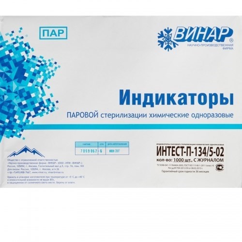 Индикатор стерилизации «Винар ИнТест-П-134/5» с журналом. Класс 4 (многопеременные индикаторы) по ГОСТ ISO 11140-1-2011. Предназначены для применения в каждом цикле стерилизации для наружного и внутреннего контроля условий стерилизации в стерилизаторах с удалением воздуха из стерилизационной камеры методом многоступенчатого вакуумирования. индикаторы представляют собой прямоугольные бумажно-пленочные полоски с нанесенными на одной стороне красно-оранжевой индикаторной меткой и темным сине-фиолетовым эталоном сравнения. Индикаторы наклеивают на каждую стерилизационную упаковку, на участок доступный для визуального осмотра. По окончании цикла стерилизации индикаторную метку каждого наружного индикатора сравнивают с цветом эталона сравнения. Если хотя бы один индикатор показал отрицательный результат контроля, все изделия, обработанные в данном цикле, считают нестерильными.