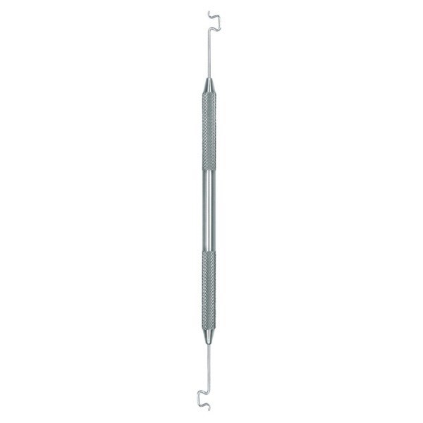 Двусторонний ортодонтический аппликатор от американской компании Hu-Friedy применяется для размещения эластичных лигатур. Изогнутые в нескольких точках под прямым углом тонкие рабочие концы легко размещают резинки.