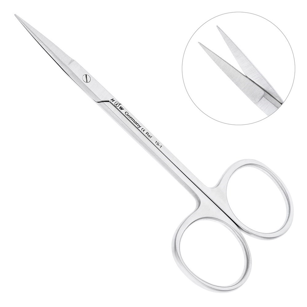 Для коррекции мягких тканей в ротовой полости применяются ножницы Iris с зубчатой поверхностью на одной из режущих граней. Производителем инструмента является немецкая компания HLW Dental Instruments.
