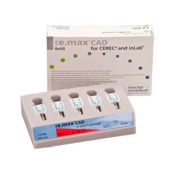 - Блоки IPS e.max CAD A14 выпускаются в 5 цветах MO (Medium Opacity – средняя опаковость) и применяются для изготовления высокоэстетичных гибридных абатментов