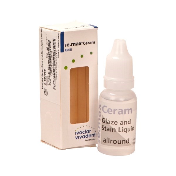 Жидкость IPS e.max Ceram Gl-Stain для глазури и красителей многостороннего применения (allround), консистенция которой подходит для традиционной работы с последующим подсушиванием. Более короткое рабочее время (примерно полдня).