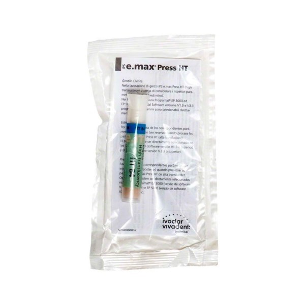 Заготовки IPS e.max Press HT (High Translucency – высокая прозрачность) отличаются высокой прозрачностью, за счет чего идеально подходят для изготовления полноанатомических прессованных реставраций (техника окрашивания). Выпускаются в 16 цветах A–D и 4 ультрасветлых цветах Bleach.