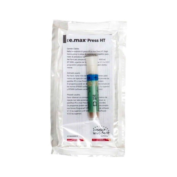 Заготовки IPS e.max Press HT (High Translucency – высокая прозрачность) отличаются высокой прозрачностью, за счет чего идеально подходят для изготовления полноанатомических прессованных реставраций (техника окрашивания). Выпускаются в 16 цветах A–D и 4 ультрасветлых цветах Bleach.