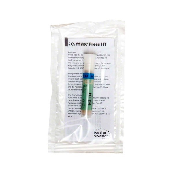 Заготовки IPS e.max Press HT (High Translucency – высокая прозрачность) отличаются высокой прозрачностью, за счет чего идеально подходят для изготовления полноанатомических прессованных реставраций (техника окрашивания). Выпускаются в 16 цветах A–D и 4 ультрасветлых цветах Bleach.