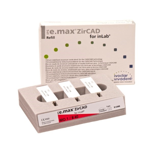 Блоки из оксида циркония IPS e.max ZirCAD inLab B40 фрезеруются в системе inLab, благодаря высокой прочности после спекания (>900 МПа) из них можно изготавливать протезы на боковые зубы. На каркасы напрессовывается материал IPS e.max ZirPress или наносится облицовочный материал IPS e.max Ceram. Выпускаются в девяти размерах и трех цветах.