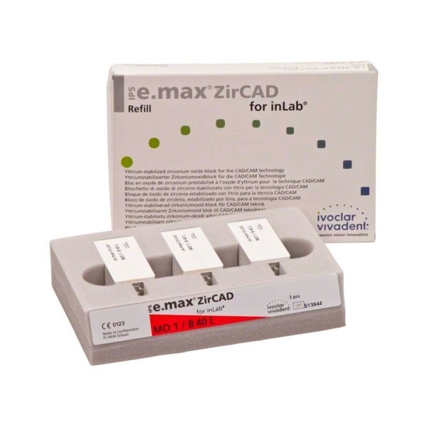 Блоки из оксида циркония IPS e.max ZirCAD inLab MO B40 L фрезеруются в системе inLab, благодаря высокой прочности после спекания (>900 МПа) из них можно изготавливать протезы на боковые зубы. На каркасы напрессовывается материал IPS e.max ZirPress или наносится облицовочный материал IPS e.max Ceram. Выпускаются в девяти размерах и трех цветах.