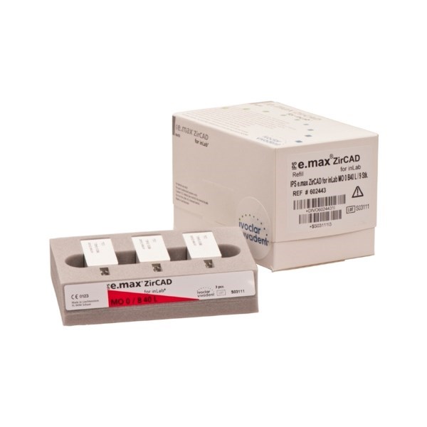 Блоки из оксида циркония IPS e.max ZirCAD inLab MO B40 L фрезеруются в системе inLab, благодаря высокой прочности после спекания (>900 МПа) из них можно изготавливать протезы на боковые зубы. На каркасы напрессовывается материал IPS e.max ZirPress или наносится облицовочный материал IPS e.max Ceram. Выпускаются в девяти размерах и трех цветах.