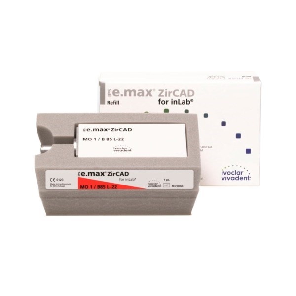 Блоки из оксида циркония IPS e.max ZirCAD inLab MO B85 L-22 фрезеруются в системе inLab, благодаря высокой прочности после спекания (>900 МПа) из них можно изготавливать протезы на боковые зубы. На каркасы напрессовывается материал IPS e.max ZirPress или наносится облицовочный материал IPS e.max Ceram. Выпускаются в девяти размерах и трех цветах.