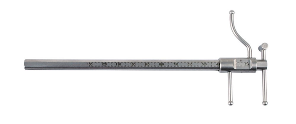 Длина 17 см. Шкала измерения 13 см, шаг 1 мм. Поперчечные щупы длиной по 25 см каждый. Изогнутый щуп для подбородка длиной 33 мм.