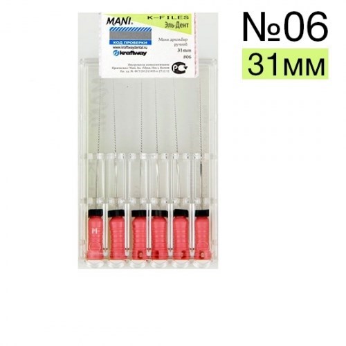 Описание: К-Files №06 31мм (6 шт.) МаниЭндодонтические инструменты K-Files MANI применяются в стоматологии в подготовительных целях перед сложными реставрациями для расширения и коррекции формы корневых каналов.