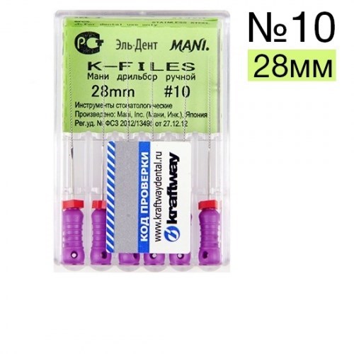 Описание: К-Files №10 Мани (28мм)Эндодонтические инструменты K-Files MANI применяются в стоматологии в подготовительных целях перед сложными реставрациями для расширения и коррекции формы корневых каналов.
