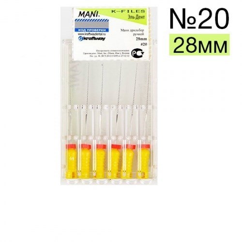 Описание: К-Files №20 Мани (28мм)Эндодонтические инструменты K-Files MANI применяются в стоматологии в подготовительных целях перед сложными реставрациями для расширения и коррекции формы корневых каналов.