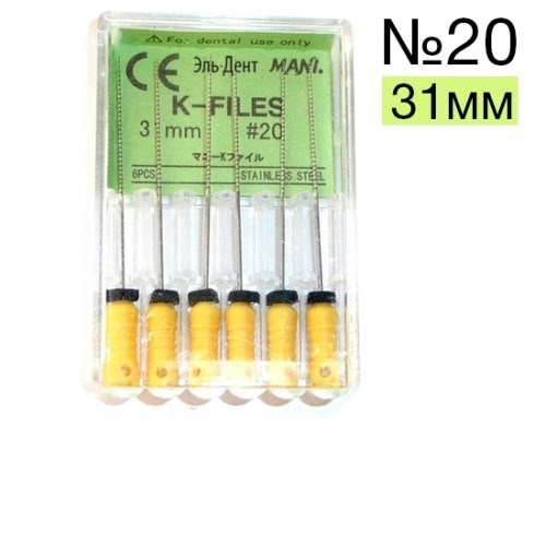 Описание: К-Files №20 Мани (31мм)Эндодонтические инструменты K-Files MANI применяются в стоматологии в подготовительных целях перед сложными реставрациями для расширения и коррекции формы корневых каналов.