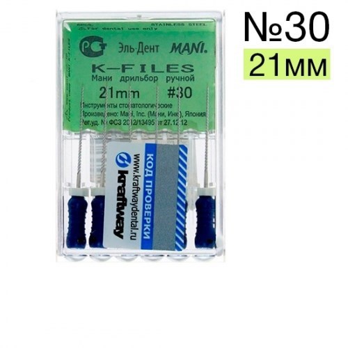 Описание: К-Files №30 Мани (21мм)Эндодонтические инструменты K-Files MANI применяются в стоматологии в подготовительных целях перед сложными реставрациями для расширения и коррекции формы корневых каналов.
