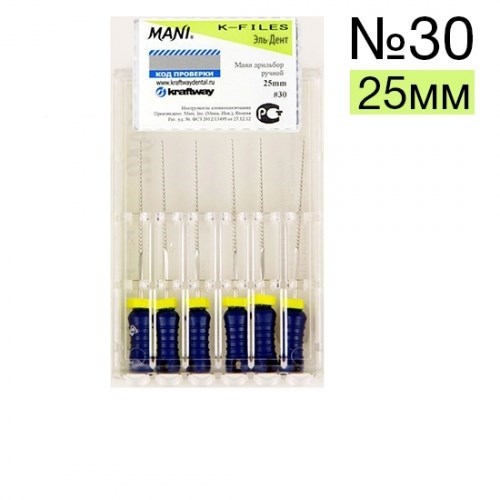 Описание: К-Files №30 Мани (25мм)Эндодонтические инструменты K-Files MANI применяются в стоматологии в подготовительных целях перед сложными реставрациями для расширения и коррекции формы корневых каналов.
