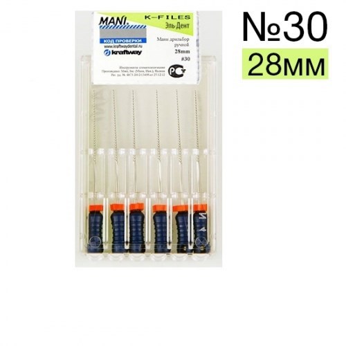 Описание: К-Files №30 Мани (28мм)Эндодонтические инструменты K-Files MANI применяются в стоматологии в подготовительных целях перед сложными реставрациями для расширения и коррекции формы корневых каналов.
