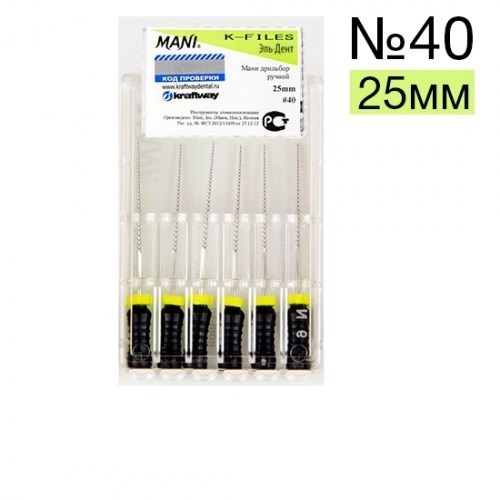 Описание: К-Files №40 Мани (25мм)Эндодонтические инструменты K-Files MANI применяются в стоматологии в подготовительных целях перед сложными реставрациями для расширения и коррекции формы корневых каналов.
