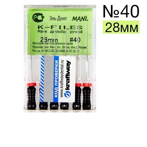 Описание: К-Files №40 Мани (28мм)Эндодонтические инструменты K-Files MANI применяются в стоматологии в подготовительных целях перед сложными реставрациями для расширения и коррекции формы корневых каналов.