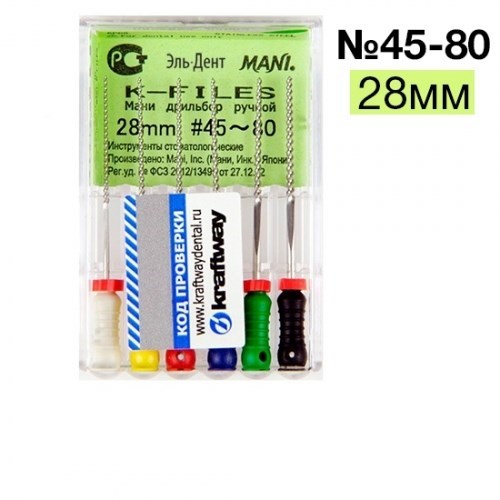 Описание: К-Files №45-80 Мани (28мм)Эндодонтические инструменты K-Files MANI применяются в стоматологии в подготовительных целях перед сложными реставрациями для расширения и коррекции формы корневых каналов.