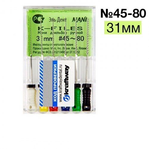 Описание: К-Files №45-80 Мани (31мм)Эндодонтические инструменты K-Files MANI применяются в стоматологии в подготовительных целях перед сложными реставрациями для расширения и коррекции формы корневых каналов.