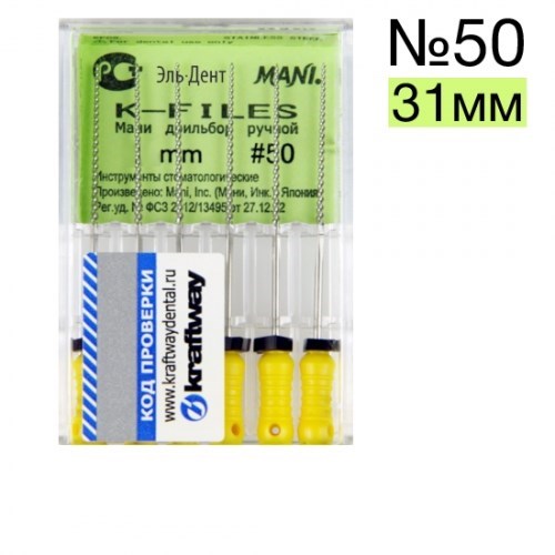 K-Files MANI (К файлы Мани) — это ручной режущий стоматологический эндодонтический инструмент со спиральной нарезкой рабочей части. Материал рабочей режущей части - нержавеющая сталь, материал рукоятки – пластик (полибутилентерефталат).