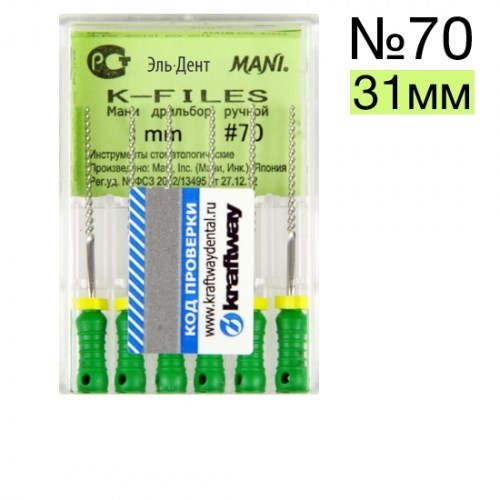 K-Files MANI (К файлы Мани) — это ручной режущий стоматологический эндодонтический инструмент со спиральной нарезкой рабочей части. Материал рабочей режущей части - нержавеющая сталь, материал рукоятки – пластик (полибутилентерефталат).