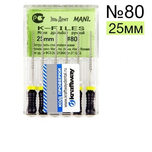 Описание: К-Files №80 25мм (6шт.) МаниЭндодонтические инструменты K-Files MANI применяются в стоматологии в подготовительных целях перед сложными реставрациями для расширения и коррекции формы корневых каналов.